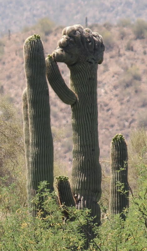 The saguaro (Carnegiea gigantea) is a tree-like cactus species in the monotypic genus Carnegiea, [...]that can grow to be over 40 ft (12 m) tall. It is native to the Sonoran Desert in Arizona, the Mexican state of Sonora, and the Whipple Mountains and Imperial County areas of California. The saguaro blossom is the state wildflower of Arizona. Its scientific name is given in honor of Andrew Carnegie. In 1994, Saguaro National Park, near Tucson, Arizona, was designated to help protect this species and its habitat. Saguaros have a relatively long lifespan, often exceeding 150 years. They may grow their first side arm around 75?100 years of age, but some never grow any arms. Arms are developed to increase the plants reproductive capacity, as more apices lead to more flowers and fruit. A saguaro can absorb and store considerable amounts of rainwater, visibly expanding in the process, while slowly using the stored water as needed. This characteristic enables the saguaro to survive during periods of drought. The saguaro cactus is a common image in Mexican culture and American Southwest films.